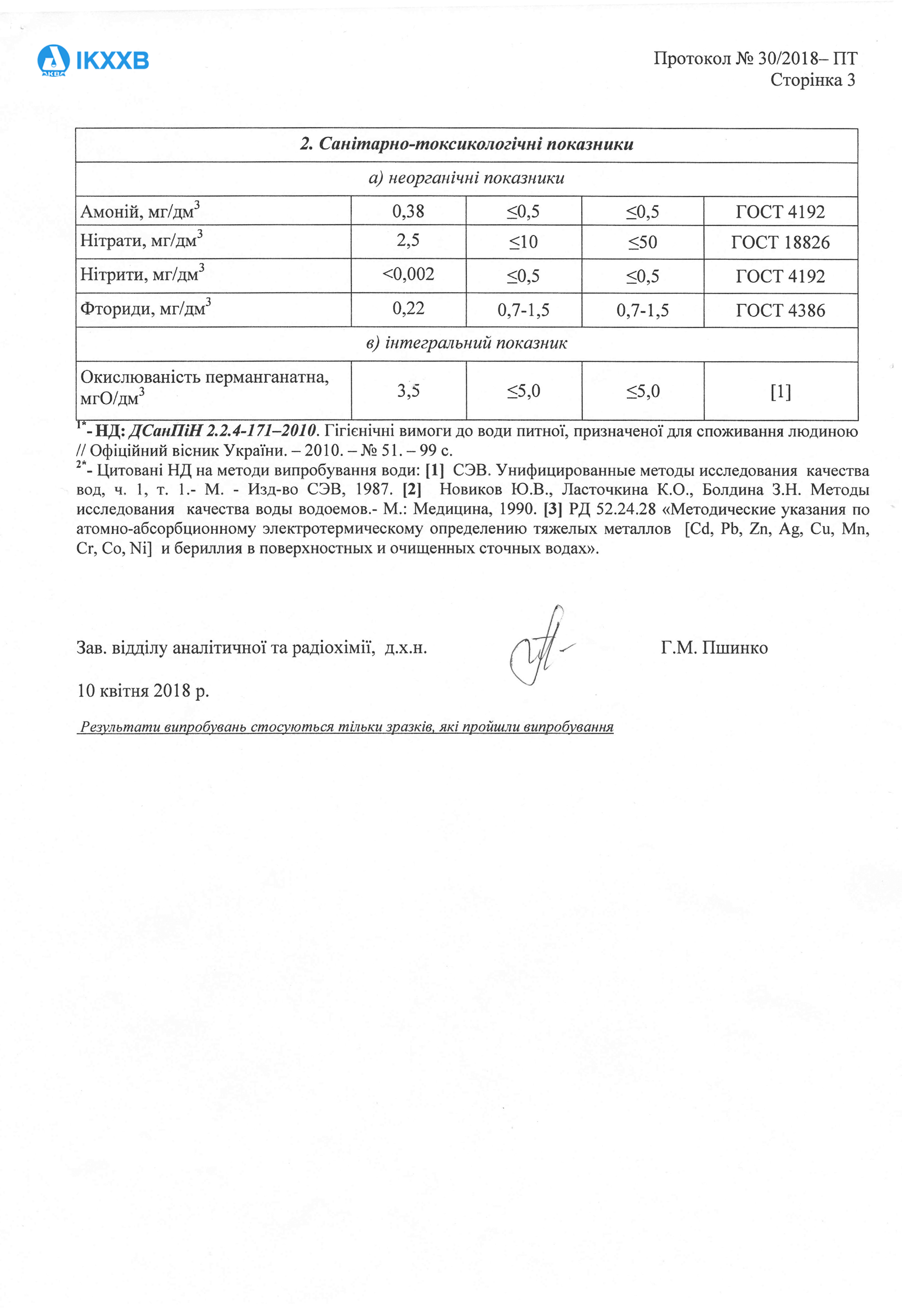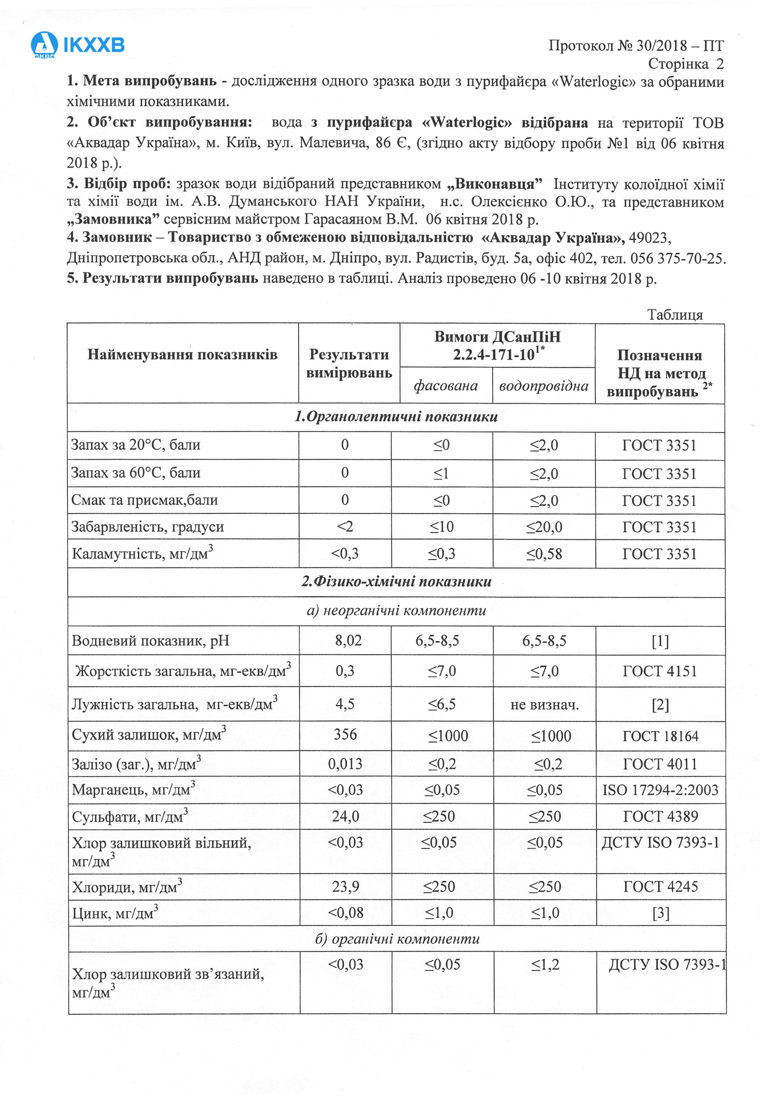 | Показники | Waterlogic | Вимоги ДСанПіН | Відповідність нормам |
